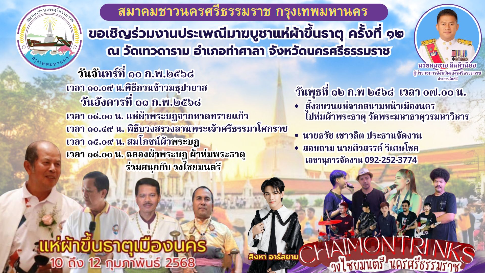 #ข่าวประชาสัมพันธ์ บอกบุญอันยิ่งใหญ่ให้พุทธศาสนิกชนสาธุชนสายบุญ ศรัทธาในพระพุทธศาสนา ที่กรุงเทพฯและ 14 จังหวัดภาคใต้ และทุกภาคส่วนได้รับรู้ได้พร้อมใจ เพื่อมาตุภูมิด้วยสำนึกรักบ้านเกิด เพื่อสืบสานวัฒนธรรมประเพณีมาฆบูชาแห่ผ้าขึ้นธาตุเมืองนคร *แห่ผ้าขึ้นธาตุ ครั้งที่ ๑๒ สมาคมชาวนครศรีธรรมราช กรุงเทพมหานคร *ความงดงามแห่งศรัทธา แห่ผ้าพระบฏ ผ้าห่มธาตุ ประทาน #จากสมเด็จพระอริยวงศาคตญาณสมเด็จพระสังฆราชสกลมหาสังฆปริณายก *ในพิธีบวงสรวงและสมโภช ณ #วัดเทวดาราม อำเภอท่าศาลา จังหวัดนครศรีธรรมราช #วันจันทร์ที่ ๑๐ ก.พ.๒๕๖๘ *เวลา ๑๐.๐๙ น.พิธีกวนข้าวมธุปายาส #วันอังคารที่ ๑๑ ก.พ.๒๕๖๘ *เวลา ๐๘.๐๐ น. แห่ผ้าพระบฏ ผ้าห่มธาตุ จากหาดทรายแก้ว *เวลา ๑๐.๔๙ น. พิธีบวงสรวง ณ ลานพระเจ้าศรีธรรมาโศกราช *เวลา ๑๕.๐๙ น.สมโภชน์ผ้าพระบฏ *เวลา ๑๘.๐๐ น.ฉลองผ้าพระบฏ ผ้าห่มพระธาตุ ร่วมสนุกกับ วงไชยมนตรี #วันพุธที่ ๑๒ ก.พ ๒๕๖๘ .เวลา ๐๗.๐๐ น.ตั้งขบวนแห่จากสนามหน้าเมืองนครไปห่มผ้าพระธาตุ วัดพระมหาธาตุวรมหาวิหาร #นายสมชาย ลีหล้าน้อย ผู้ว่าราชการจังหวัดนครศรีธรรมราช ประธานในพิธี #พล.ต.อ.สุรเชษฐ์ หักพาล น