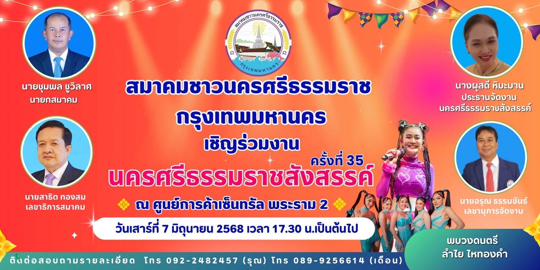 สมาคมชาวนครศรีธรรมราช กรุงเทพมหานคร ในนามของ คณะกรรมการบริหาร ที่ปรึกษากิตติมศักดิ์ คณะทำงาน ขอกราบขอบพระคุณ นายอารี ไกรนรา เลขานุการรัฐมนตรีว่าการกระทรวงแรงงาน และ ประธานที่ปรึกษากิตติมศักดิ์ สมาคมชาวนครศรีธรรรมราช กรุงเทพมหานคร นายสมชาย ลีหล้าน้อย ผู้ว่าราชการจังหวัดนครศรีธรรมราช ประธานเปิดงาน พล.ต.อ.สุนทร ซ้ายขวัญ อดีตรักษาการผู้บัญชาการตำรวจแห่งชาติ และ อดีตนายกสมาคมชาวปักษ์ในพระบรมราชูปถัมภ์ นายถวิล ไพรสณฑ์ อดีตรัฐมนตรีว่าการทบวงมหาวิทยาลัย ปลัด ชุ้น ณัฐเดช กังสุกุล ปลัดจังหวัดนนทบุรี นายทวีศักดิ์ สุทิน กรรมการสภาอุตสาหกรรมแห่งประเทศไทย ประธานสภาอุตสากรรมจังหวัดภาคกลางและปริมณฑล ประธานกรรมการบริหารกลุ่ม บริษัทปุ๋ยศักดิ์สยาม(ศักดิ์สยามกรุ๊ป) ตลอดแขกผู้หลักผู้ใหญ่ทุกๆท่านที่มาเป็นเกียรติร่วมงาน ตลอดพันธมิตร MOU นายกสมาคมและประธานชมรมต่างๆรวมถึงผู้สนับสนุนทุกๆท่านและแขกผู้มีเกียรติทุกๆท่านรวมทั้งเพื่อนพ้องน้องพี่ ที่ให้เกียรติกับทางสมาคมชาวนครศรีธรรมราช กรุงเทพมหานคร ในงานนครศรีธรรมราชสังสรรค์ ครั้งที่ 35 เมื่อวันเสาร์ ที่ 7 มิถุนายน 2568 ณ ศูนย์การค้าเซ็น